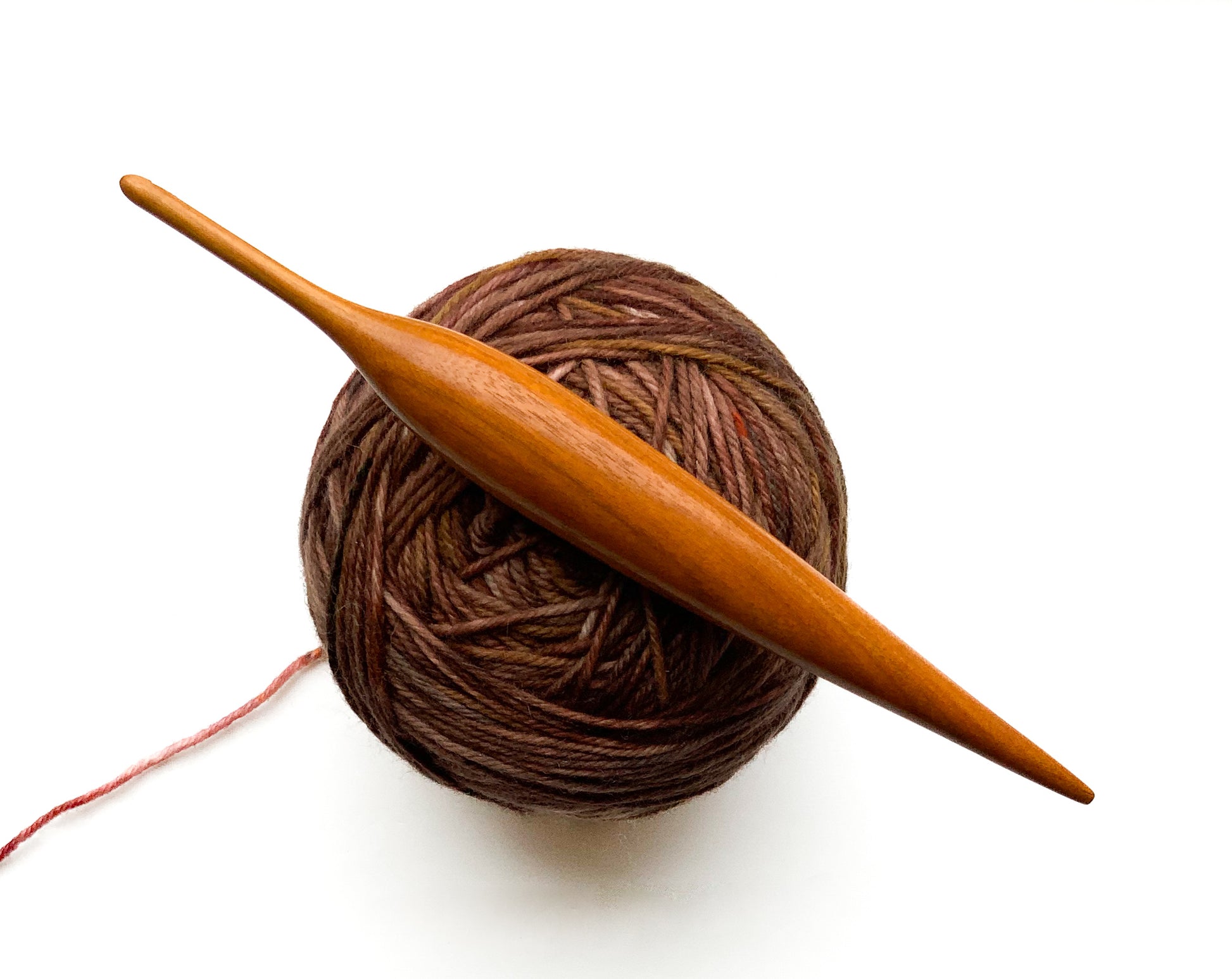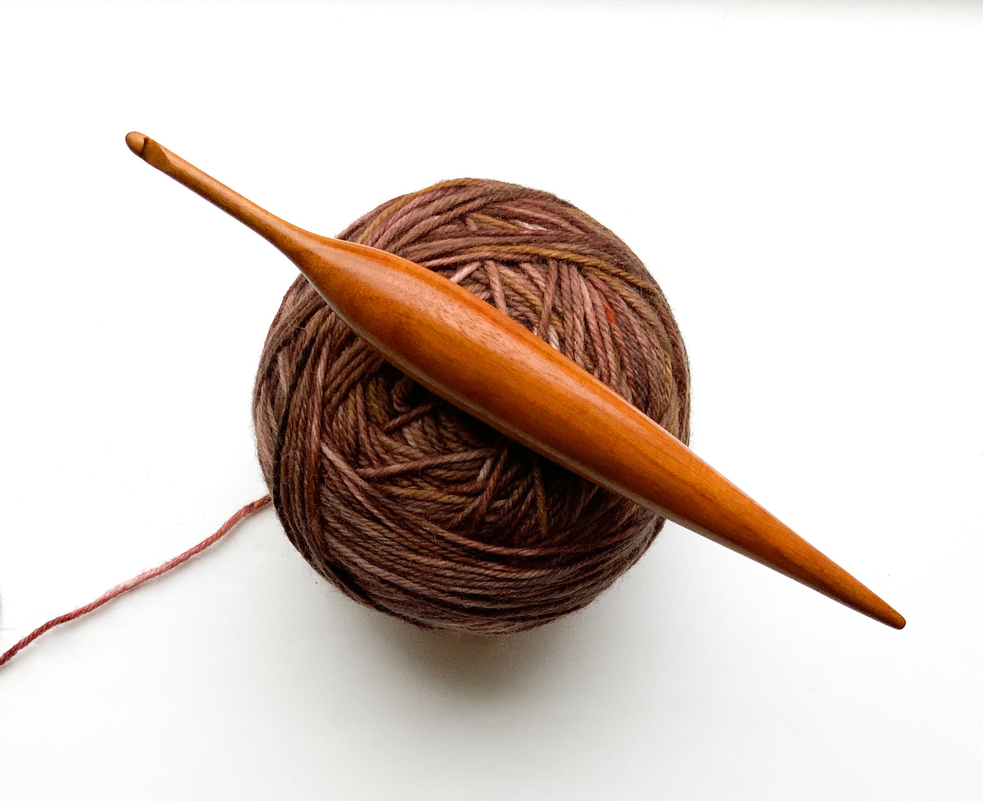 This bold hook is crafted from chitka viga wood, found in the tropical areas of Mexico and Central America. This bright orange hook is wonderful when working with darker colored yarn and glides smoothly through each stitch. It has an even grain that is on display while creating your piece.